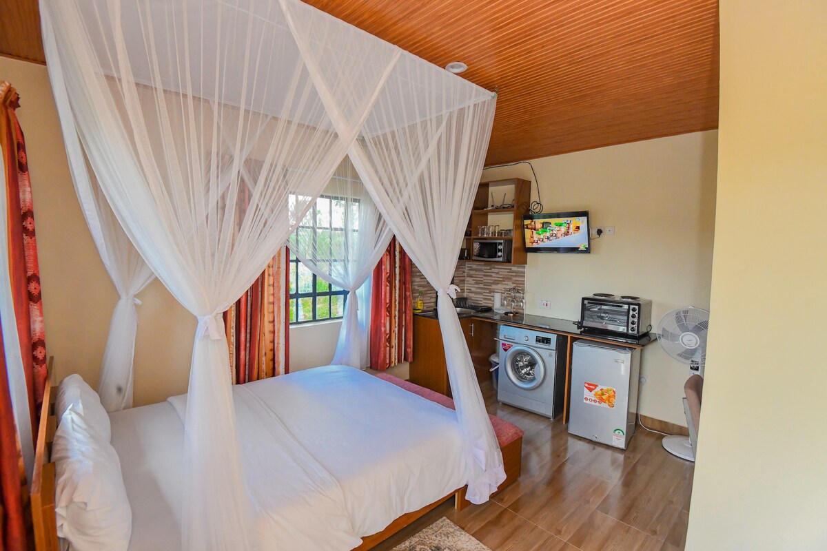 這間時尚的小單間公寓有維多利亞湖前面的大花園。 步行1分鐘即可抵達海灘。 作為有門禁社區的一部分,有24小時保安。 距離基蘇木機場( Kisumu Airport ) 25分鐘,距離基蘇木鎮( Kisumu town ) 35分鐘。 大院非常適合觀鳥、安靜安靜的住宿體驗。 單獨或陪同時很棒。 有WIFI、有線電視。 提供洗衣機。 現場安全停車。大院內還有其他8棟不同尺寸和不同家具的別墅。