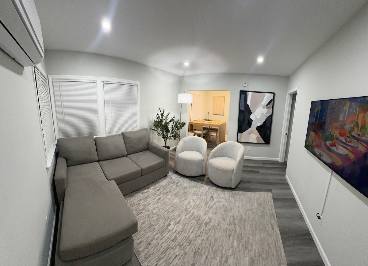放鬆身心!此空間沒有共用牆壁,包括私人後院、強大的空調/暖氣、您自己的洗衣機/乾燥機、舒適的座椅,可供放鬆/工作。 提供WiFi和50英寸電視和防火棒。 光線可以明亮、平靜或變色! 廚房乾淨、現代化,讓您感到放鬆。 這是一個500平方英尺的空間,有閣樓。 閣樓有2張牀,配有完整的墨菲和皇後。 位於太平洋🏄🏽♂️、洛杉磯市中心和迪士尼🌃樂園之間🎢。