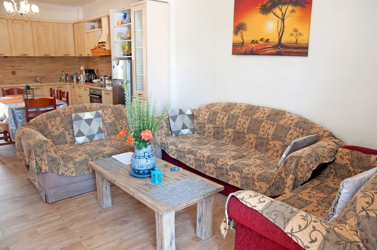 歡迎來到Filoxenia House! 坐落在Anemochori村中心的美麗舒適的一樓房源。 房源設有私人花園、兩輛車的安全停車位和私人入口,非常適合尋找放鬆住宿的家庭、朋友或情侶入住。