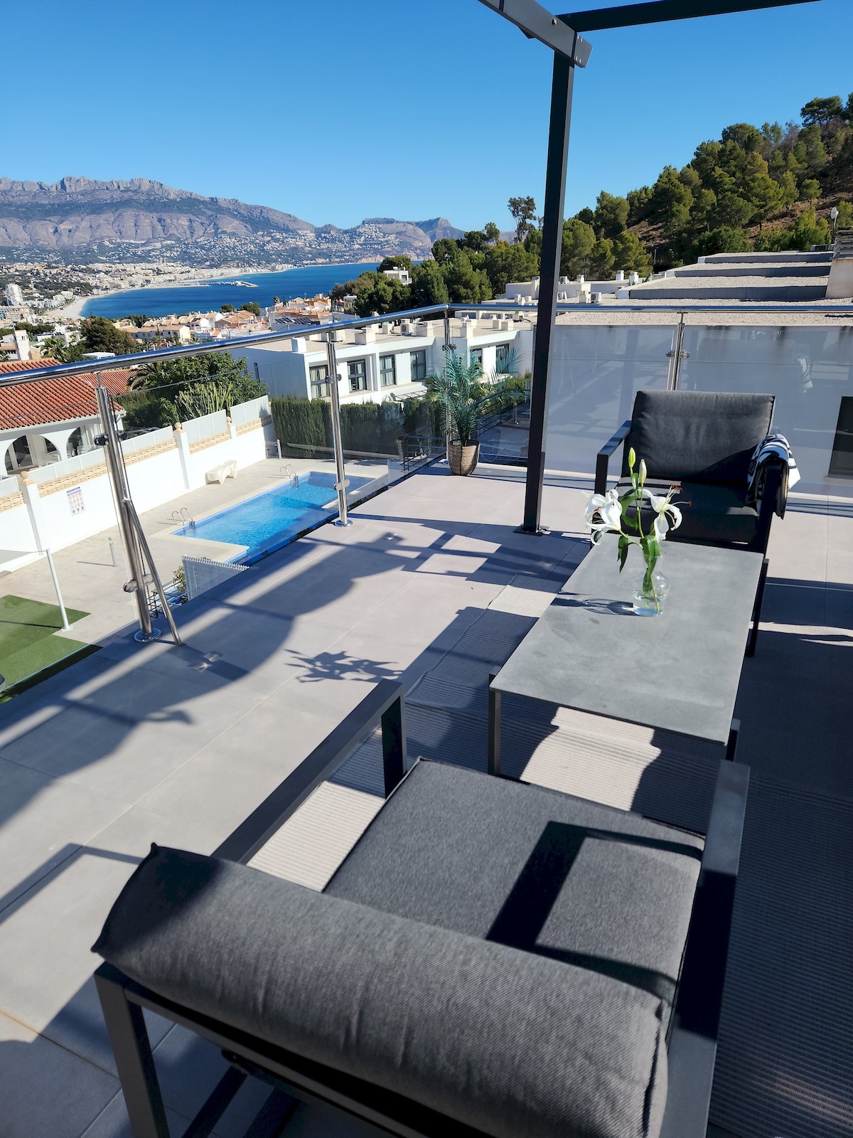 Casa Zen is a beautiful holiday penthouse with two spacious terraces to enjoy amazing views over the mountains and the sea. It's recently renovated with a fully equiped kitchen, new bathrooms and new furniture. It offers a peaceful and stylish experience, being in the center of Albir at only 3 min walking distance from the main beach and the walking promenade with a large variety of nice restaurants. There is also a community swimming pool to relax. It's on the third floor, no elevator.