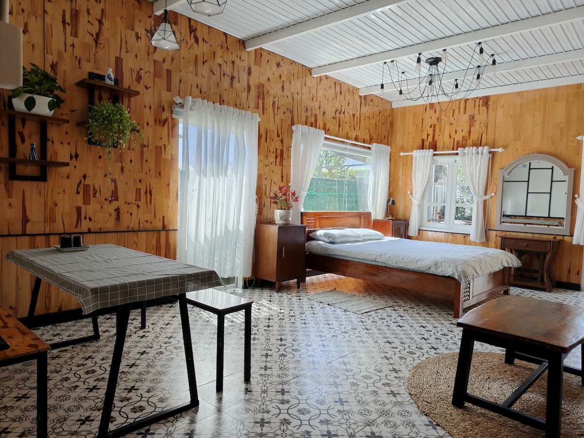 A cozy studio in Dalat, nestled on a small hill with views of a serene part of the city. The room includes an attached bathroom with a sunken shower that doubles as a cool tub on warm days. Designed with an open layout to bring nature closer to your stay. Why us: Great location: 10-min walk to downtown, food stalls nearby. Lush garden. Free homemade breakfast, tailored to your diet. Free coffee and tea anytime. Secure, spacious parking. Friendly host family: make you feel at home.