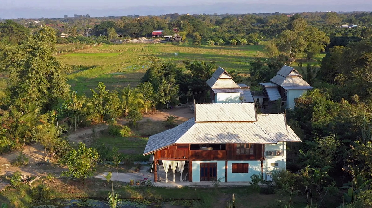 在柚木小屋中更接近大自然,坐落在宏偉的花園中,毗鄰稻田,距離蘭納國際學校(Lanna International School)僅5公里。 我們的新家庭臥室「方舟」提供舒適的住宿,可供1組(僅供您使用)最多10位房客入住。 超高速WiFi。 房子坐落在我們的花園內,我們歡迎您作為新朋友進入我們的家。