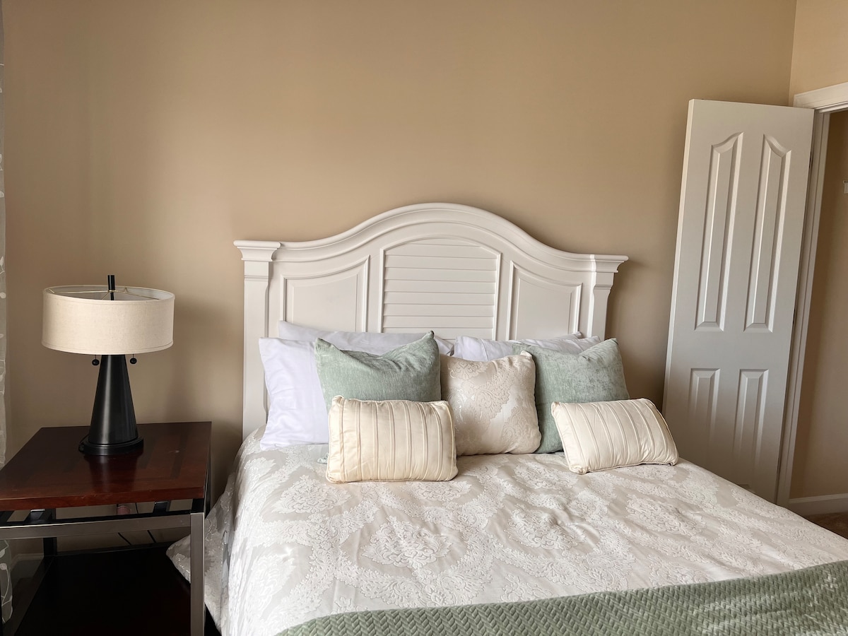 位於印第安小徑新建聯排別墅內的舒適私人臥室和浴室。享受專屬工作區、全套廚房設施、戶外壁爐座位、高速網路和免費停車位。距離太陽谷餐飲區僅幾分鐘路程,距離夏洛特市中心 25 分鐘路程,距離韋弗利、瓦克斯霍和門羅 15 分鐘路程。社區配套設施包括度假式泳池(季節性開放)、匹克球場和步道。 21歲以下人士謝絕入住。