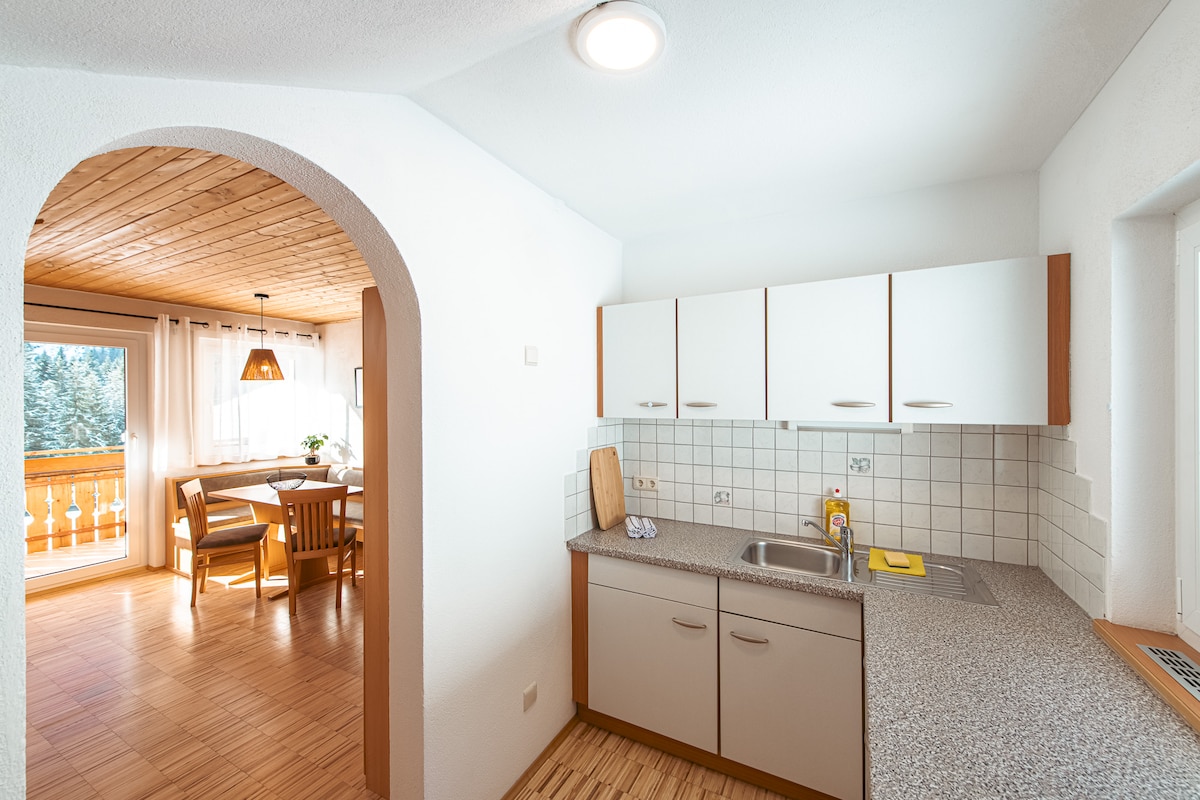 Seefelder高原現代高山風格的優雅頂樓公寓。 最後一樓的舒適安靜的公寓最多可供4人舒適入住。 它有明亮的生活用餐區域、設備齊全的現代廚房、兩間雙人臥室、兩間衛浴、地暖、免費Wi-Fi和一個非常大的私人露臺。 從那裡,您可以在夏季和冬季欣賞驚人的山景和Inn Valley景觀。