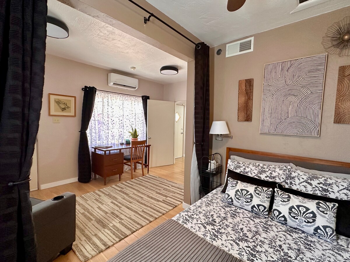 *****最少租用 30 天**** 這間單間公寓位於歷史悠久的Alameda Depot市中心,靠近農夫市場、餐廳、圖書館、公園等街區。 浴室、帶爐子的小廚房、咖啡機、咖啡、烹飪必需品、微波爐、大衣櫃、加大雙人牀、沙發、電視、私人庭院和通往大庭院的通道。 洗衣機/烘衣機。非常適合短期住宿,但也適合長期住宿。 必須透過應用程式存取入住資訊