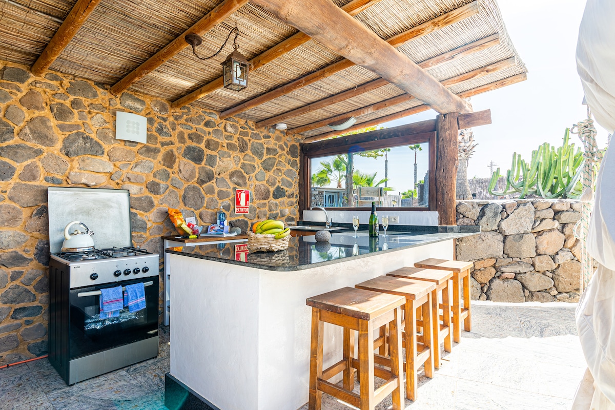 體驗風格的豪華露營! 豪華的8公尺超級蒙古包,位於海灘位置,有2個窗簾睡眠區域,非常適合尋找額外空間的家庭/情侶入住。 設備齊全的完美度假屋,可欣賞迷人的海景、大露臺和花園。 適合全家人度假。 離網的Finca de Arrieta設施包括太陽能加熱的泳池、來自母雞的雞蛋、免費WiFi、遊樂場、誠實商店。 步行300分鐘即可抵達海灘和餐廳。