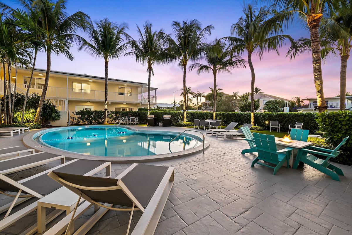 Beautiful 1 bedroom condo located directly on the intracoastal with a heated pool. This unit DOES NOT have water view from the condo BUT has amazing views of the intracoastal waterway from the patio/pool area. Enjoy watching the yachts sail by along with taking in amazing sunsets from the dock. Work from home, 1 block from the beach! Quiet and peaceful. Within walking distance to many shops and local amenities! Perfect for couples, young families and groups of friends traveling together.