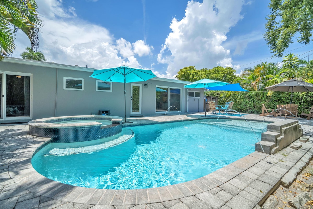 家具精美的高級房源,配有私人、僻靜的後院綠洲。 享受加熱的鹽水泳池、按摩浴池、郁郁葱葱的景觀,以及配備現代舒適設施的時尚室內空間。 設備齊全的廚房、瓦斯烤架、沙灘椅、免費 WiFi 和有線電視。 非常適合放鬆、娛樂或遠程工作。 步行即可抵達Wilton Drive ,開車即可抵達海灘和商店。