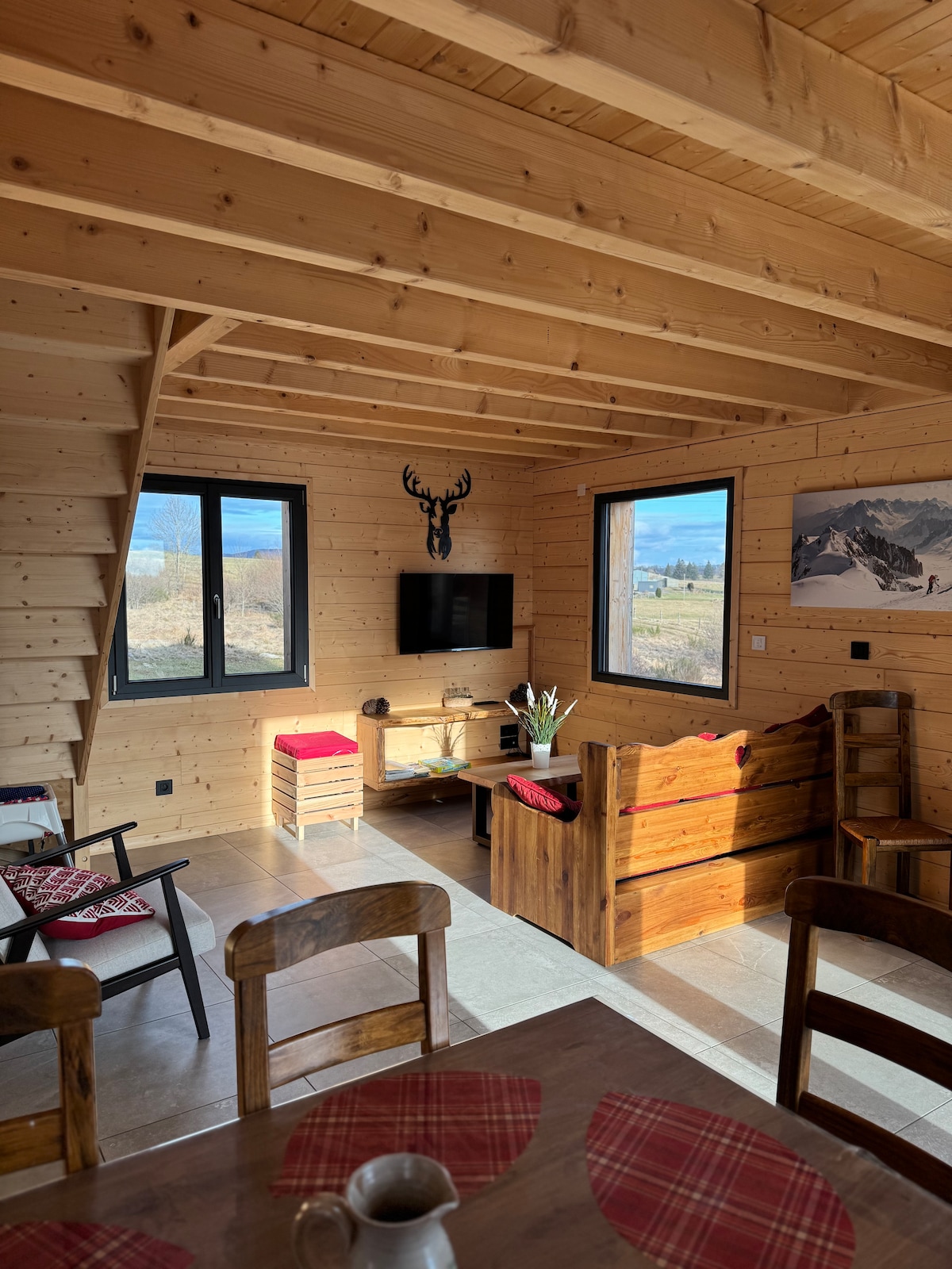 140 平方公尺的豪華小木屋,包括 45 平方公尺的大客廳和配備齊全的廚房(食物處理機、咖啡豆機、瑞士起司火鍋、可麗餅機、Nespresso 咖啡機) 包括 5 間臥室,其中 3 間配有加大雙人床,1 間配有標準雙人床,1 間配有 4 張雙層床,2 間浴室,包括床單 住宿結束後可提供清潔服務 遮蔭用餐區, 夏季