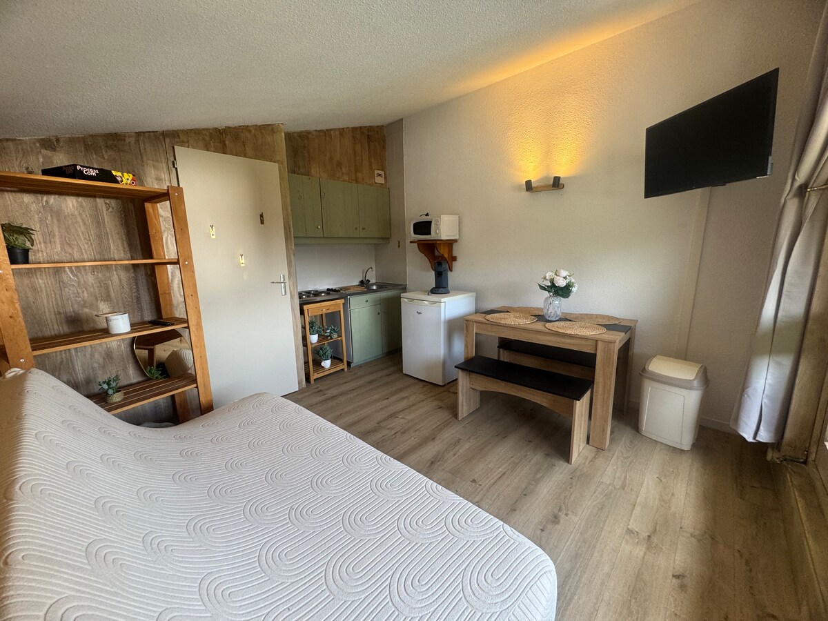 安靜住宅區的溫馨單間公寓。 - 山區(雙層床) - 獨立廁所(懸掛式儲物櫃) - 帶浴缸 + 淋浴間的浴室 - 客廳: 用餐區(折疊桌+椅子+儲物長凳) 小廚房(電磁爐、抽油煙機、微波爐、烤麵包機、水壺、Nespresso 咖啡機等) 一張雙人沙發床(140/190) 儲物櫃 - 阳台(桌椅) Wi-Fi 存取 - 1 個封閉式車庫 + 1 個滑雪用具櫃 - 室外停車位
