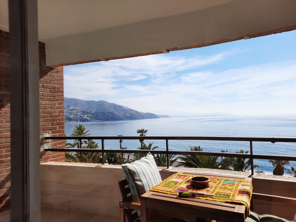 Precioso apartamento en primera línea de playa con fantásticas vistas al mar Mediterráneo, piscina comunitaria en verano, parking privado, wifi de fibra rápido, TV plana de 50" sistema Android, aire acondicionado, Almuñécar, Playa de Velilla, Costa Tropical, edificio Intiyan. Todos los servicios a metros andando (supermercado, farmacia, carnicería, restaurantes, pescadería, tiendas, fruterías). La espaciosa terraza, el salón-comedor y la cocina tienen vistas maravillosas a la playa y el mar.