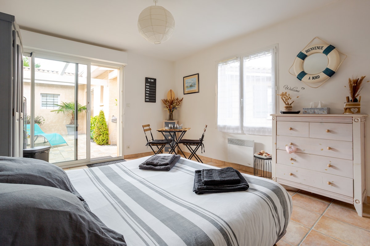 在含羞草的樹蔭下,您將欣賞到這座小木屋的真實性,它距離古讓-梅斯特拉斯 (Gujan-Mestras) 的港口和商店僅幾步之遙。 這間獨立的 27 平方公尺 T2 設備齊全,讓您住得舒適(Senseo 咖啡機、洗碗機、洗衣機、床單、毛巾、WiFi、4 輛自行車等)。 非常適合兩人入住,沙發床可提供兩個額外的床位。您還可以享用露台(配備烤盤)和戶外花園。