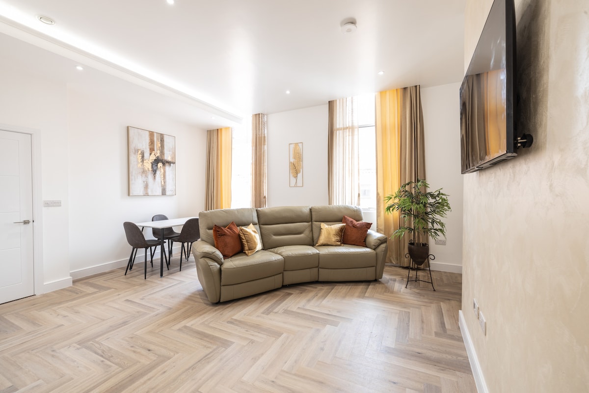 在這個位於萊斯特市中心的時尚空間中好好放鬆身心。 這間寬敞的豪華公寓設備精良,最多可容納4位房客。 休息室有55英寸智慧電視,可收看Netflix、YouTube等,也有WiFi。 有一張沙發床,配有第二套床上用品,可以變成一張完整的雙人床。 有一間寬敞的豪華浴室,提供洗漱用品。 現代化廚房設備齊全,配有現代化電器。
