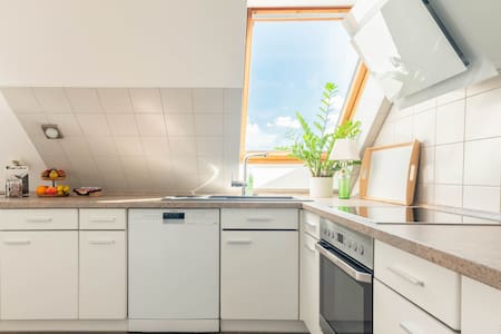 約40平方米的乾淨明亮公寓,配有小廚房、起居區和獨立睡眠區。非常漂亮、明亮的浴室,配有淋浴和馬桶以及整合式的2人桑拿房(Klafs)。在寒冷的季節散步後,這裡是放鬆身心的理想場所。公寓位於三樓 樓,並有自己的獨立入口。房東住在同一棟房子裡。公寓有一個封閉的停車位。自行車可以安全地停放在院子裡。時尚的環境。