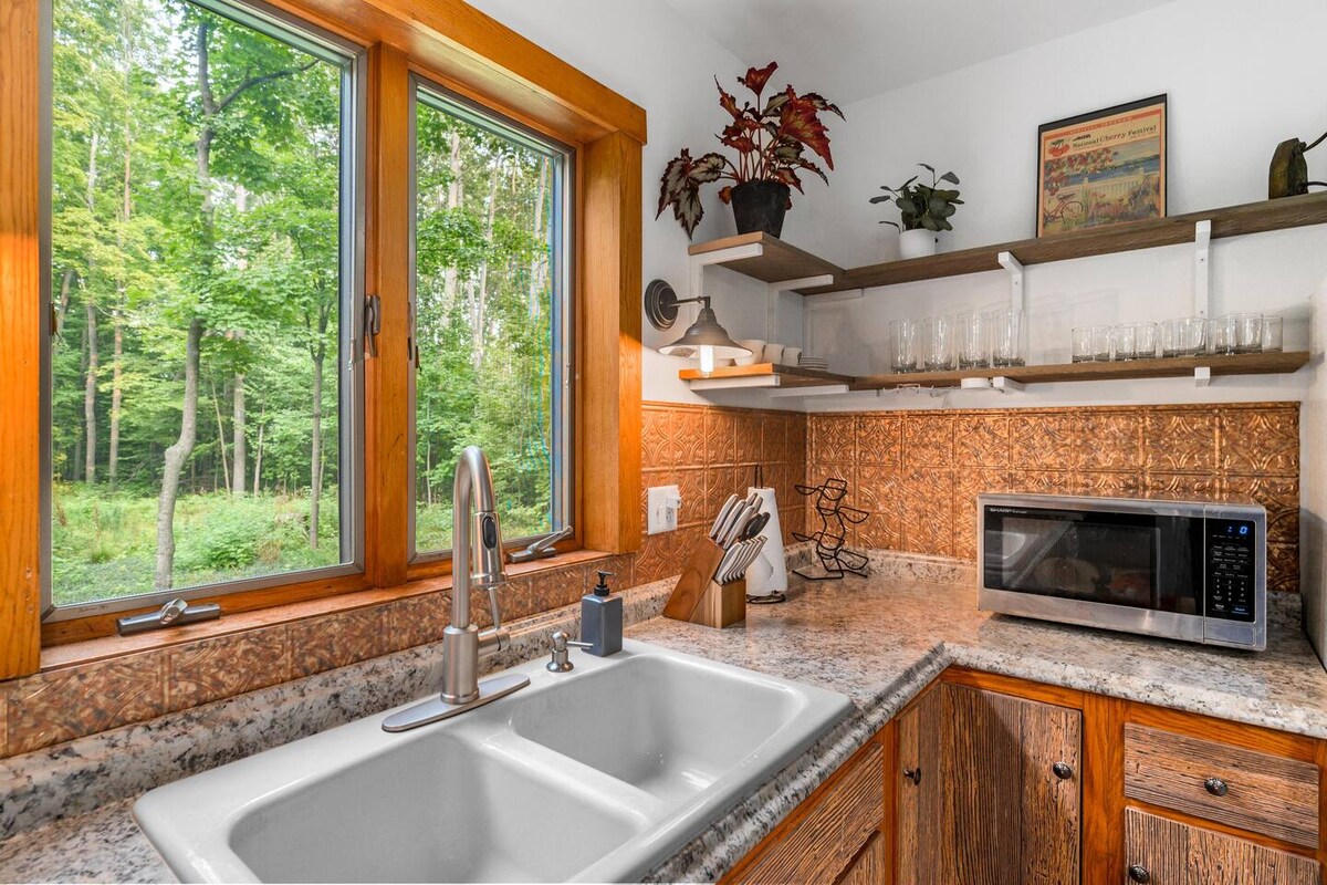 Clarity House坐落在Glen Arbor的中心,是一間現代小木屋,有3間臥室和3間全功能浴室;戲劇性的開放式廚房/大房間;拋光混凝土地板(帶地暖);大島是中央聚會地點,焦點是超大的南/東/西面窗戶,以獲得最大的日光; 24英尺天花板;時尚的設計和家具。 安靜的戶外露臺,有火坑和熱水浴缸,感覺「在森林裡」,儘管在市中心!