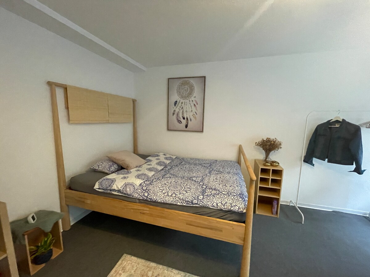 我們的度假公寓位於我們平房的閣樓。 它由一個房間組成,包括起居區、睡眠區和小廚房。 此外,還有浴室。 (單間公寓)您可以通過我們房子的主入口門,通過公共走廊和樓梯,通過我們的畫廊到達。 只有我們的房客住在樓上,也可以用獨立的鑰匙上鎖。 房源位於一個安靜的住宅區內。