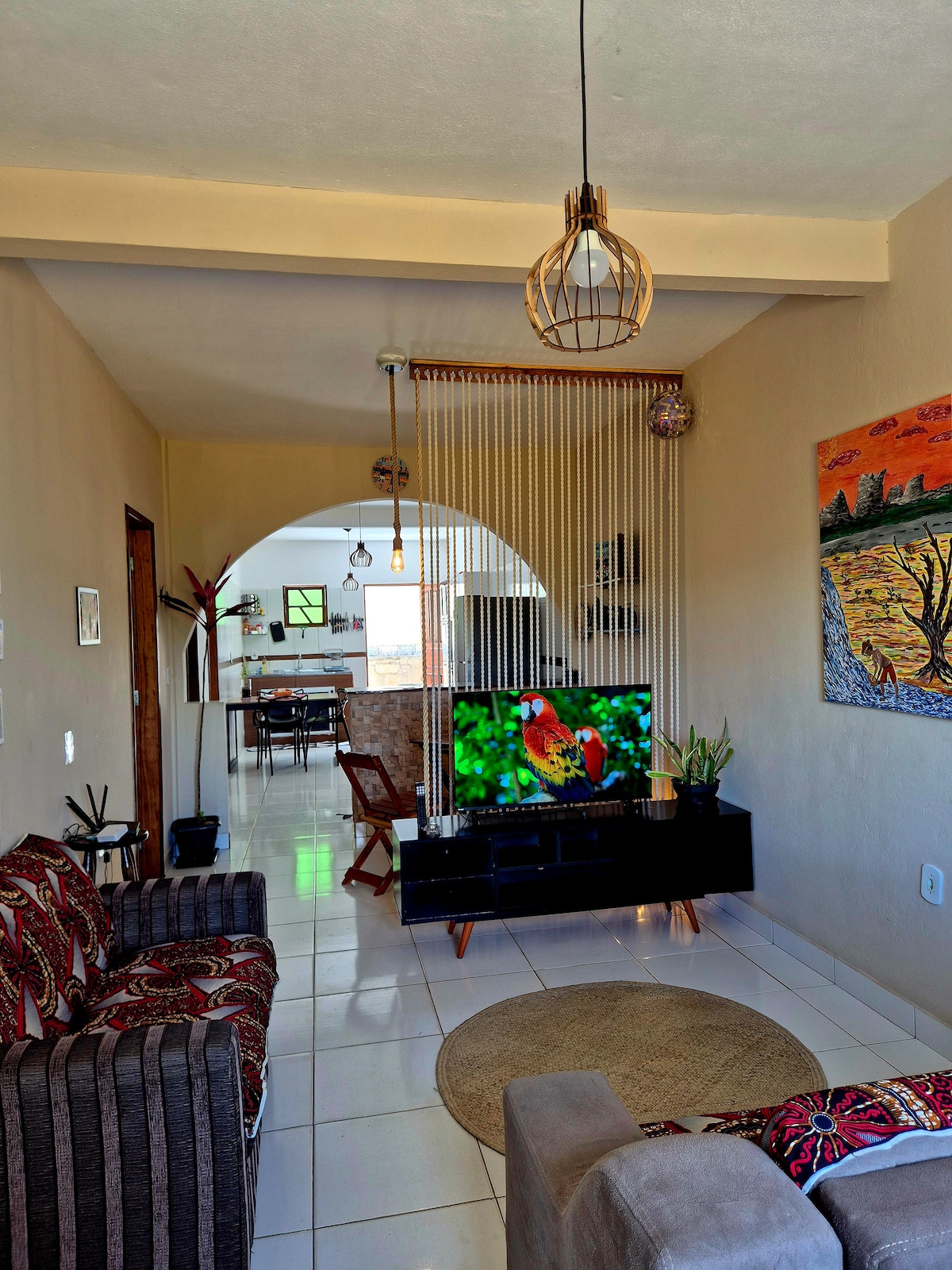 房子環境舒適,充滿藝術和音樂氛圍。此外,還有令人驚嘆的景觀,可以看到Morrão、Morro Branco和我們特殊的Chapada Diamantina的其他地形。坐落在一片廣闊的土地上,有當地的樹木,與當地社區和自然和諧相處。 距離村莊3公里(開車8分鐘)。不到1公里(3分鐘)即可抵達Fumaça入口和市場等服務。靠近瀑布和步道。 前往房源很方便。