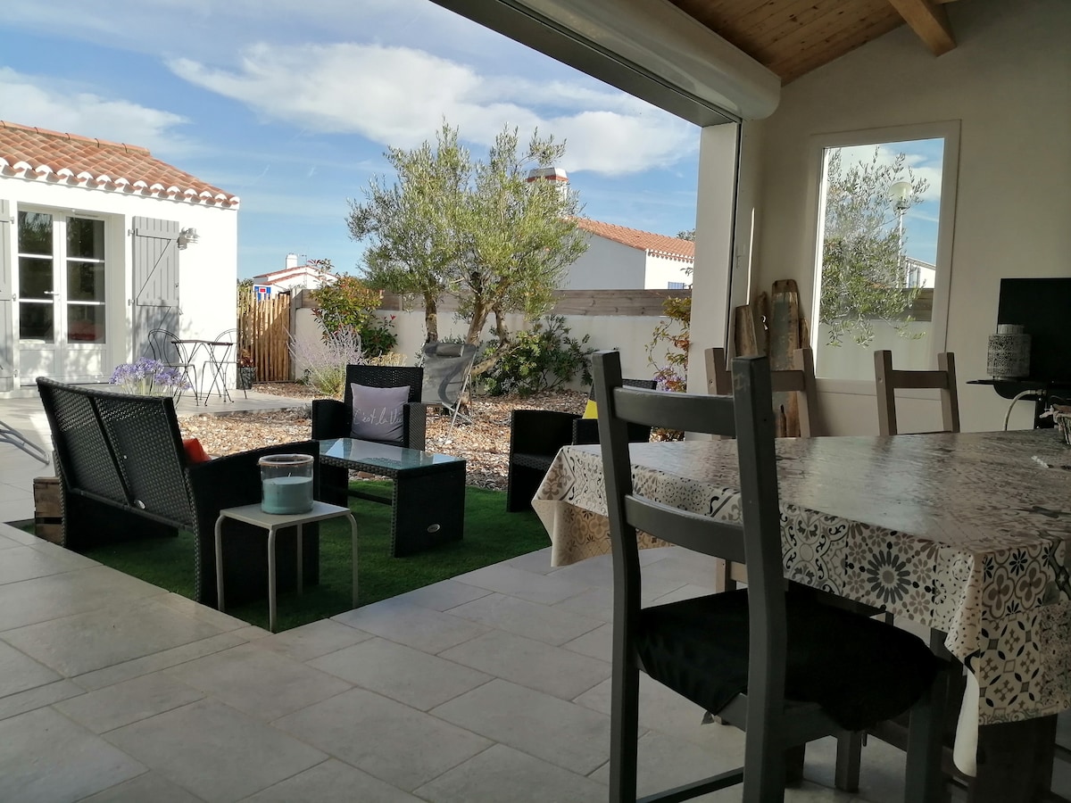 Belle maison noirmoutrine sur la commune de l'Epine, mise en valeur avec élégance et fonctionnalité, sécurisée et fermée par portail. Cour et terrasses paysagées. Mobiliers extérieurs (tables et chaises de jardin - bancs - chaises longues - ensemble de repas - barbecue gaz) Douche extérieure (retour de plage). Maison principale de 100m2 avec annexe de 20m2. Pièces lumineuses et aérées. Cuisine équipée ouverte sur la pièce de vie. Équipements électroménager et literie de qualité et récents.