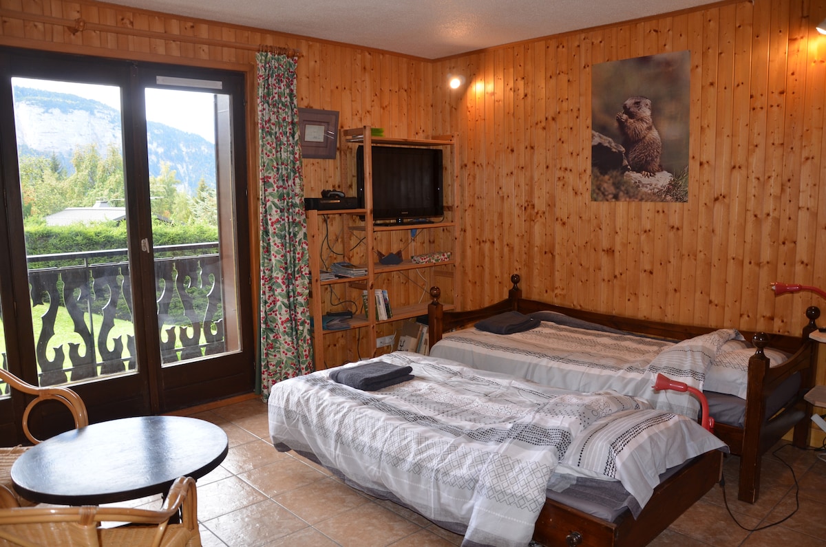 Ce studio unique en rez de jardin est situé en plein centre des Carroz vous permettant un accès a toute les commodités a pied. L'arrêt bus qui mène au piste de ski est a seulement 50m de l'appartement. Le studio est idéal pour un couple ou de jeunes parents. Il s'agit d'un logement tout confort: lave vaisselle, machine à laver et le WIFI. Le linge de lit est automatiquement fournis .La salle de bain est elle équipé d'une baignoire JACUZZI.