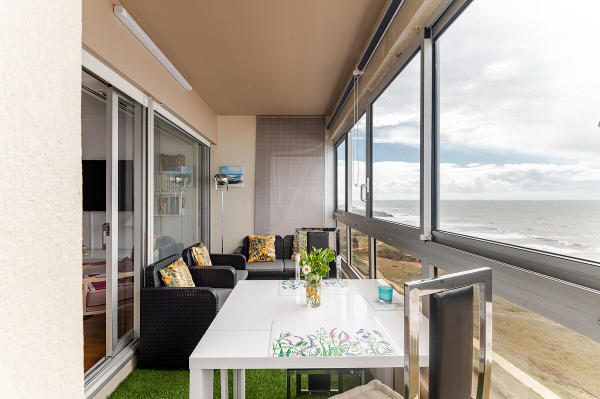 Face à la mer: profitez d'un panorama d'exception. Superbe appartement T2 (2/4 pers) rénové en 2024 - GRAND CONFORT. La plage et la dune sont au pied de l'appartement (sans route à traverser). Vue remarquable sur l'océan et l'île d'Yeu depuis l'espace repas, la loggia et même depuis le lit de votre chambre. Admirez les couchers de soleil en amoureux, en famille ou entre amis. Vous disposez de votre propre garage fermé; idéal pour votre voiture et pour ranger vélos, remorque et jeux de plage.