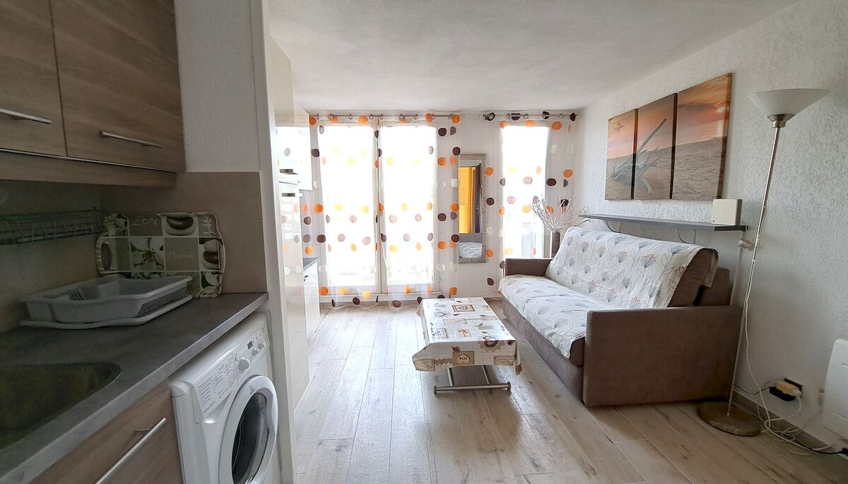 27 平方公尺的公寓,位於花園底層,步行 2 分鐘即可抵達海灘。入口、客廳、浴室、設備齊全的廚房。寬敞的儲物空間。兩張獨立的大型折疊床。朝南。私人露台,配有庭院家具。在安全的停車場中,有私人編號的停車位。附近有商店,步行即可抵達。