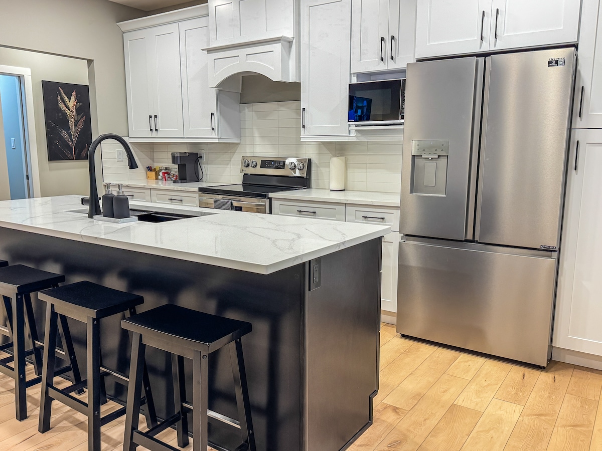 Welcome to the Haven Oak Retreat – a large luxurious home tastefully designed with a modern-retro theme, including an outdoor summer pool and hot tub! Our 3800 sq. ft. home is centrally located in west Lethbridge, near many amenities. Our property boasts a bright, open floorplan, large windows, multiple living areas perfect for large groups, and a beautiful view of the river valley and the High-Level bridge. Our home is in a quiet, sought-after neighborhood and backs onto a green space.