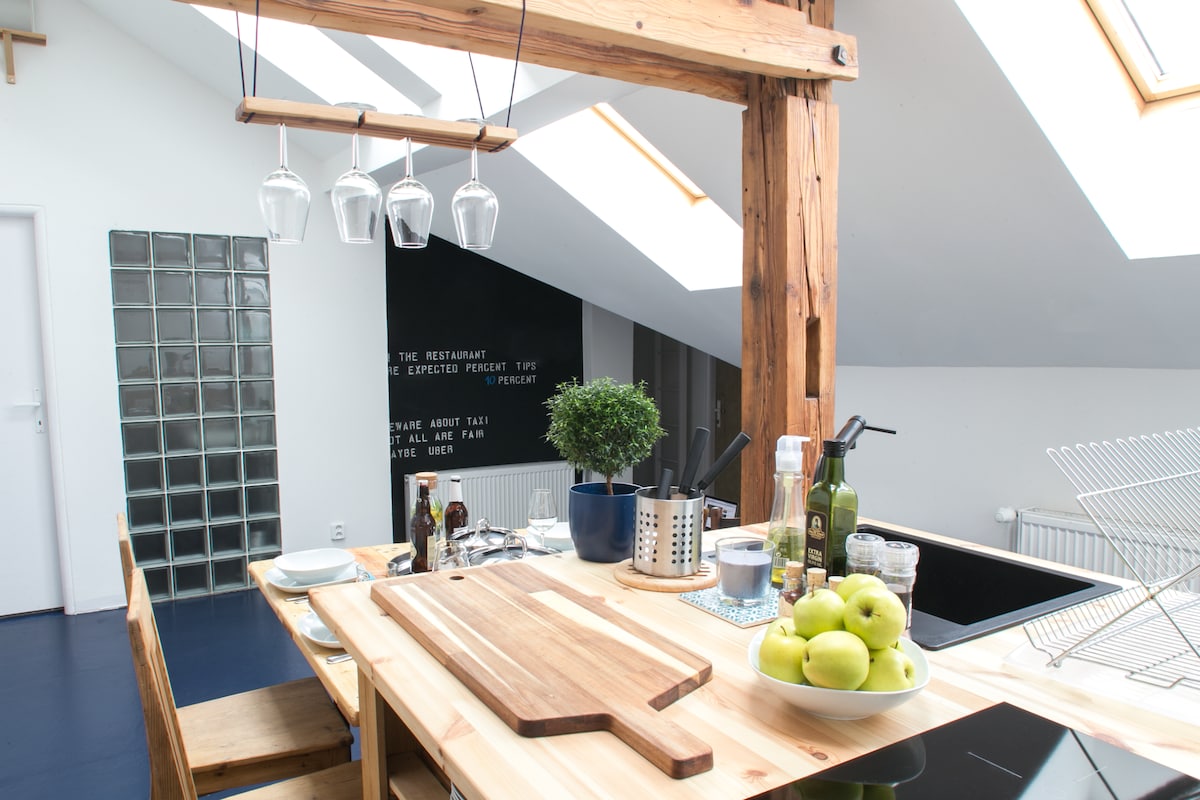 探索我們位於布拉格的80平方公尺浪漫閣樓,這是一個獨特的設計空間,有7公尺高的天花板和私人花園。 這個地方適合情侶入住,沐浴在光線中,提供面向竹子的木製露臺。 享受加大雙人床、設備齊全的廚房和藝術和真實的氛圍。 距離車站10分鐘的寧靜天堂。 這個地方有歷史:在共產主義政權下,花園是一所學校的庭院。