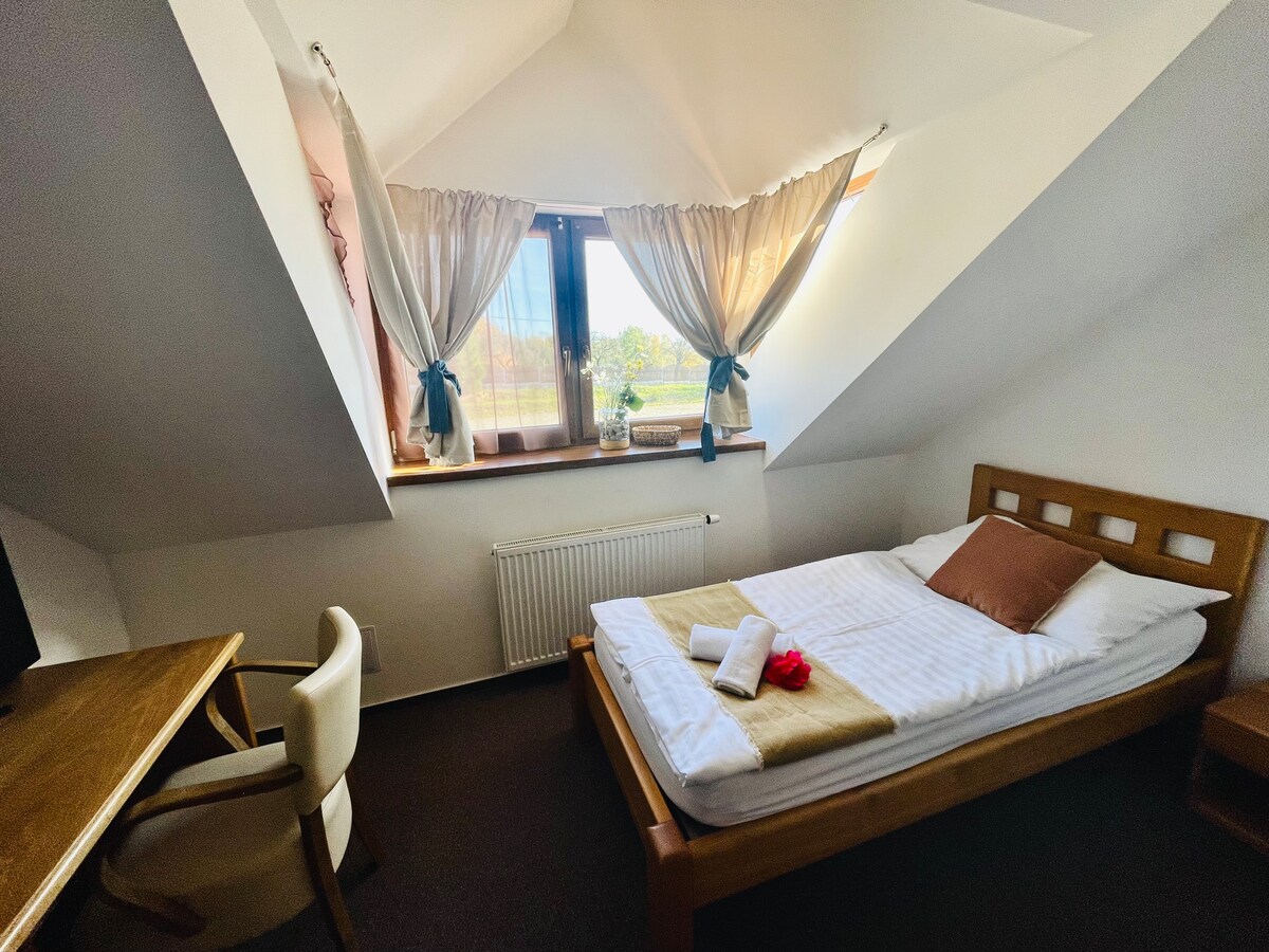 Pokoj je umístěn v 2. patře dvoupatrového farmářského hotelu na venkově, obklopeného zelení a horami. Jsou zde ustájeni koně a je zde restaurace s wellness (vířivou vanou a saunou). Můžete si také objednat jezdecké výukové hodiny na koni, jak pro děti či pro dospělé a nebo si objednat relaxační procedury (masáže apod.) výzdobu tohoto okouzlujícího ubytování si zamiluješ.