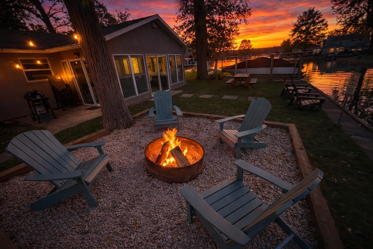 全年開放! Tecumseh Island Channel安靜舒適的湖畔小屋!包括碼頭!適合各種規模的團體!湖畔最佳位置,四周景觀非常好!美麗的改造,時尚的裝飾。3間臥室,可舒適入住10人!石英櫃檯、嵌入式照明、電壁爐。設備包括沙發床、4K HD電視和ROKU。高速網路、Keurig咖啡機(免費K-Cups)、微波爐、冰箱、烤箱/爐具、設備齊全的廚房。