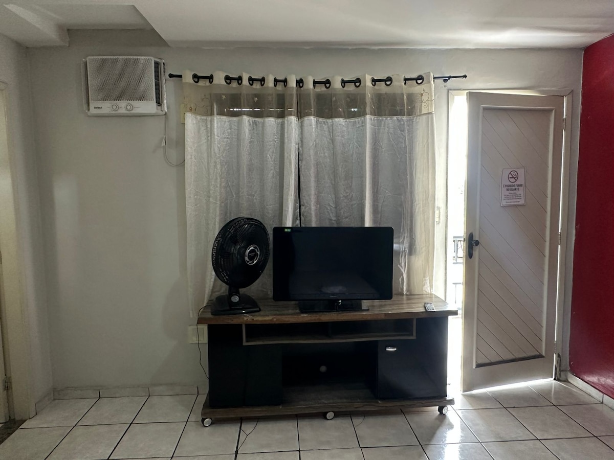 距離 Linhares/ES 中心 1 公里 房客使用權限 *您可以使用整套公寓。 * 公寓位於2樓,需要爬樓梯才能進入,並且還有一個寬敞的露臺。 其中包括: • 帶空調的套房 • 帶風扇的房間; •Wi-Fi 網路; •全套寢具; • 熱水淋浴; •冰箱; •微波爐; •爐子; •全套廚房用具; *不提供清潔和衛生用品。