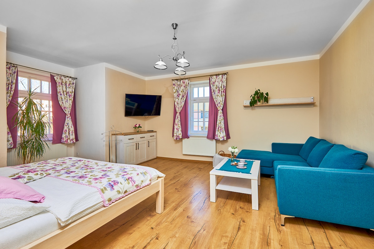 距離捷克克魯姆洛夫市歷史中心僅幾步之遙,我們提供一套寬敞、陽光充足、新翻修的公寓,供您入住和休息。別墅位於安靜的地區,有自己的住戶停車位。公寓位於頂樓,裝潢時尚,可滿足最挑剔的客人,但室內裝潢仍忠於原始風格。您想在早上吃一頓豐盛的早餐嗎?只需支付少量費用,我們就會在拐角處的咖啡館為您提供完美的早餐!