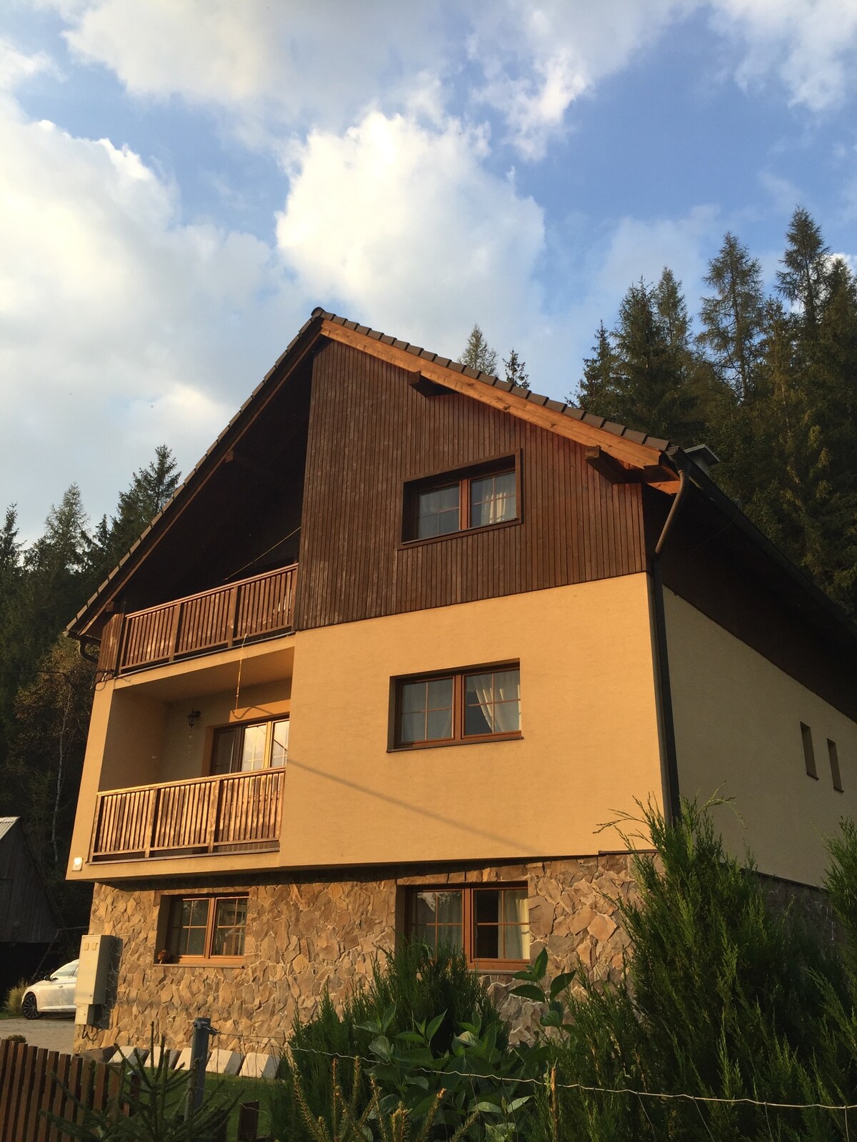 現代翻新的家庭住宅,分為兩間獨立的公寓。 每間公寓包括大廳、有客廳有廚房的客廳、帶廁所的浴室和臥室。 共用場所:滑雪存放、入口大廳。 提供涼亭和花園,並與房東共用。