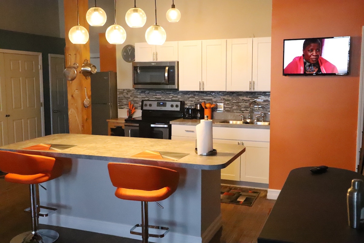裝潢精美的單臥室公寓,地理位置優越。 包括停車位! (一輛車。) 適合長期或短期住宿。 無論您是住宿幾天、幾週還是逐月,這裡都是您想去的地方! 這間公寓位於市中心。 步行即可抵達許多很棒的餐廳、酒吧、音樂會場所和體育賽事。 我們可以容納需要長期住宿的商務旅客。