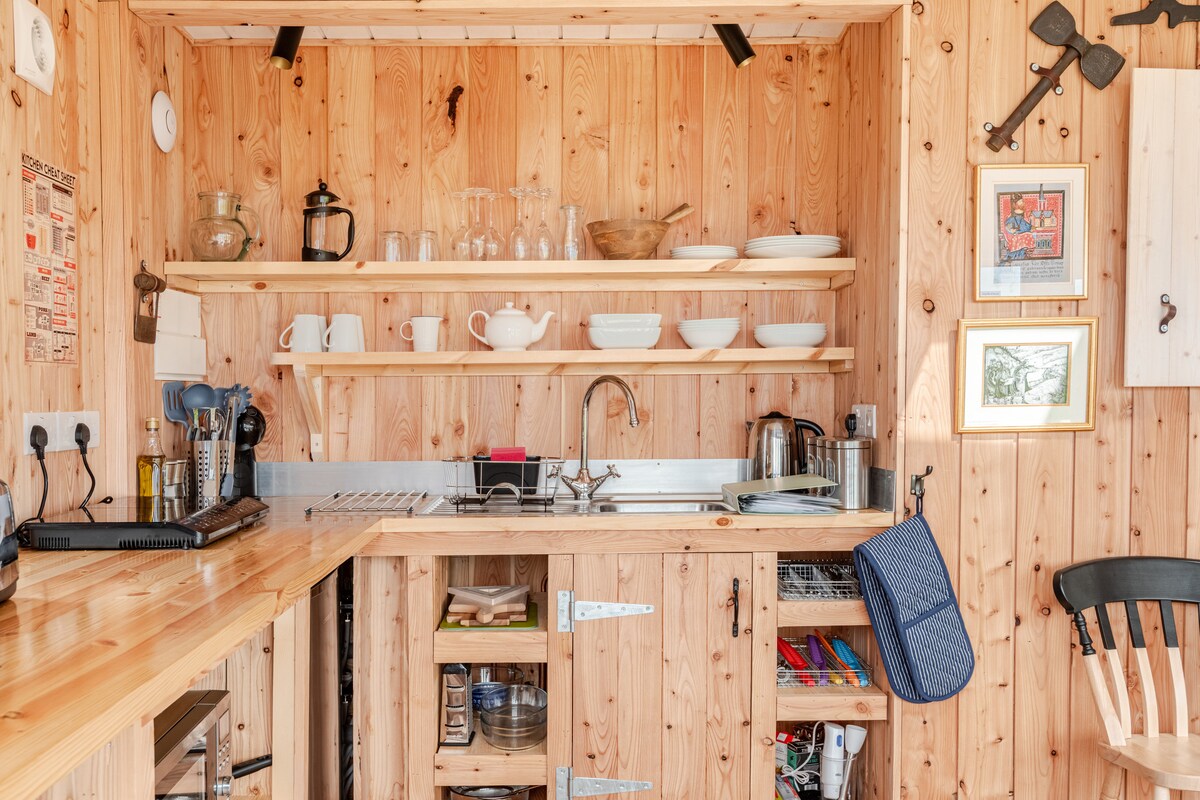 當您享受短途越野車前往我們林地的盡頭時,當您遇到我們坐落在樹頂的美麗林地小木屋時,您會感到驚訝。 當您沉浸在周圍的大自然中時,您會立即感到放鬆。 在甲板上躺椅為您提供晨間咖啡的完美場所,聆聽鳥兒的歌聲,並在柴火熱水浴缸中放鬆身心,然後在原木燃燒器前放鬆身心,享受林地的寧靜。