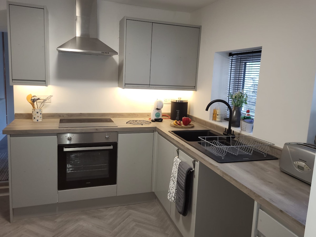 新的穀倉改造。我已嘗試保持特色。裝飾是農業/工業,盡可能重複使用農場周圍的原材料。有三張特大床,全套房。1 x樓上有非常寬敞的臥室,配有沙發和陽臺,以及2間較小的地面臥室。每個房間都有電視和WiFi。主客廳包括廚房、桌子、大型L型沙發和咖啡桌:室外桌椅、烤肉和存放自行車的遮蔽區域和電動車充電器( 50p/kw )等。