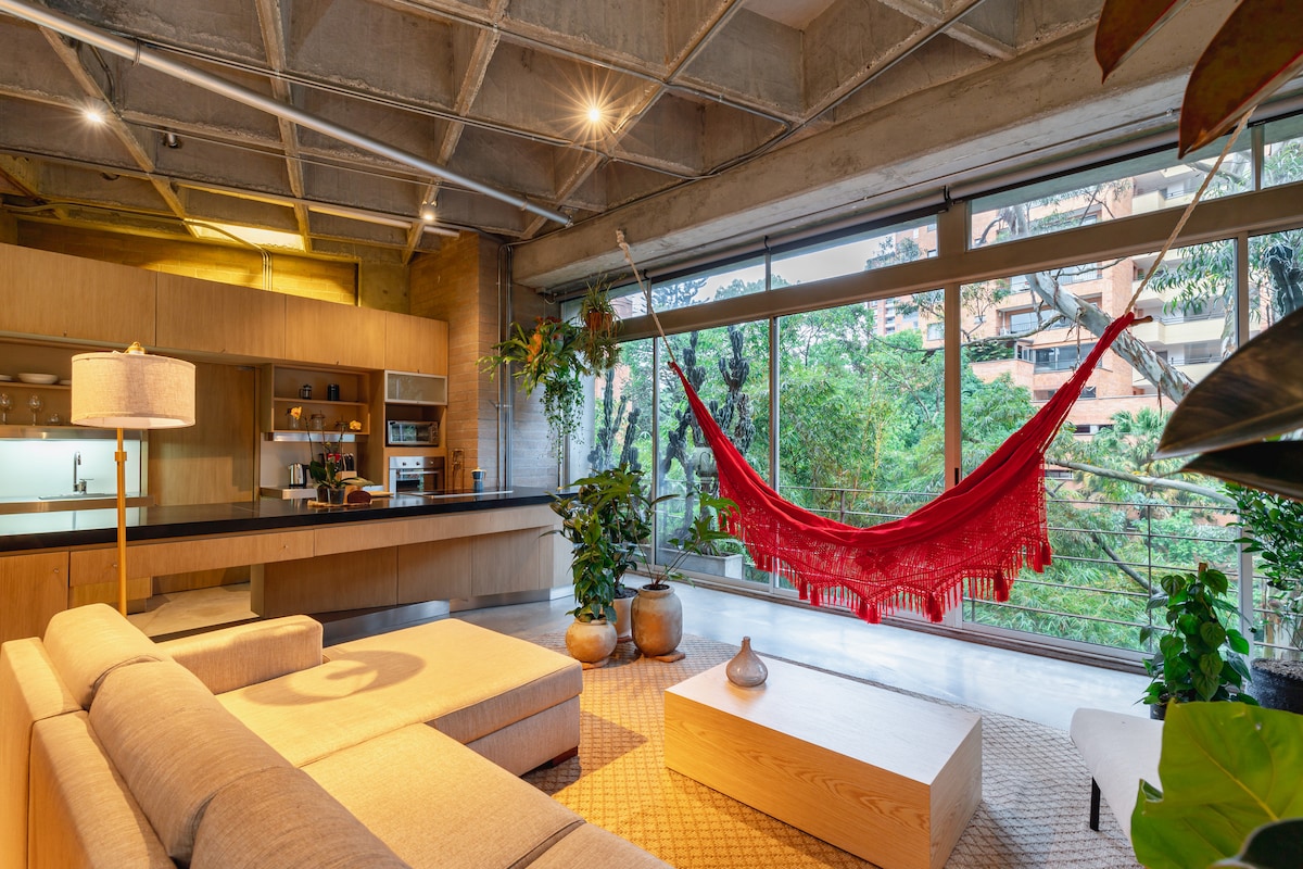 Welcome to our industrial loft in El Poblado, just steps from Provenza! Enjoy a modern space with high ceilings, panoramic windows, and a private balcony with garden views. It features a King-size bed, fast WiFi, a fully equipped kitchen, and a dedicated workspace. Just minutes from the best restaurants, cafés, and bars. Self check-in, 24/7 security, and free parking. Book now!🚀