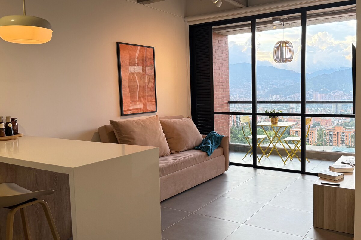 美麗時尚的公寓,可欣賞美德因的山景,位於Poblado ,步行5分鐘即可抵達Tesoro購物中心,搭乘計程車8分鐘即可抵達Provenza。 注意:大樓仍在最後的建設細節中,因此可能會有噪音、灰塵或服務故障,由於這些不便,我們的價格現在低於市場價格。