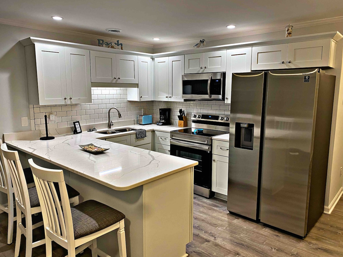 在這個設計時尚又安靜的空間中好好放鬆身心。新翻修的1300平方英尺下層複式單位,開放式。在泳池、溫水水療中心、匹克球球場和果嶺旁閒逛!享受海景和微風、海灘通道、短途旅行到默特爾海灘最好的景點,或在全功能廚房中創造一些特殊的東西,坐在50英寸智慧電視前放鬆身心,然後前往兩間臥室和兩間寬敞的浴室。