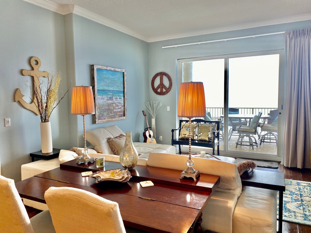 雄偉海灘度假村1號塔,單間公寓,8樓!歡迎來到您的海灣前線天堂!配有室外和室內泳池、按摩浴池和650英尺的海岸線!度假村內有很多好玩的地方!星巴克、H2O Bar & Grill、市場和禮品店、電影院等! 這間單間公寓可容納3人入住。 加大雙人床和新的記憶海綿床墊。單人折疊床。智慧電視、WiFi、設備齊全的廚房、俯瞰墨西哥灣的私人陽臺!