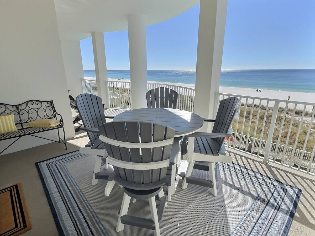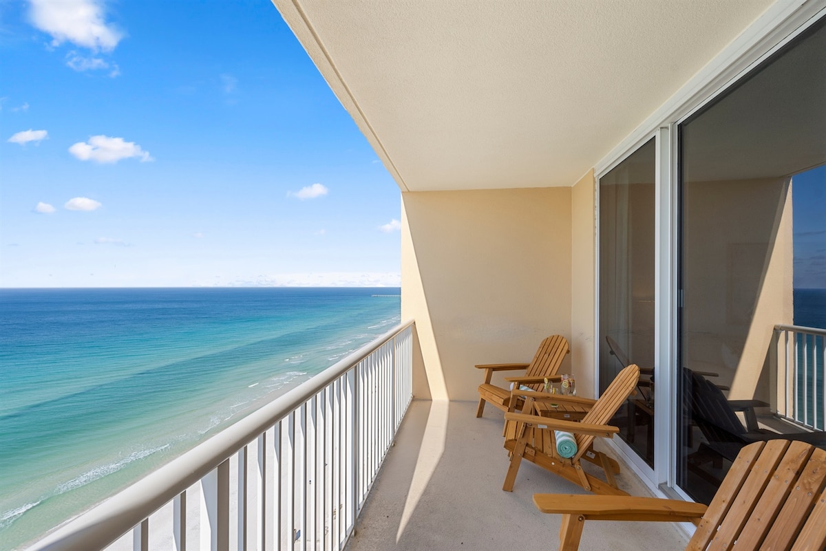 This GULF FRONT BEACH condo has a style all its own. Long Beach is a gated community and features the longest stretch of sand in PCB. This newly renovated condominium on the 7th floor has panoramic views of the Gulf from every room . Spanish-style ceramic tile floors & premium granite countertops throughout. The huge curved balcony attracts spectacular sunsets. The resort has low occupancy so the super-fast elevators won't leave you waiting. The resort has a 25 yo age minimum in order to book.