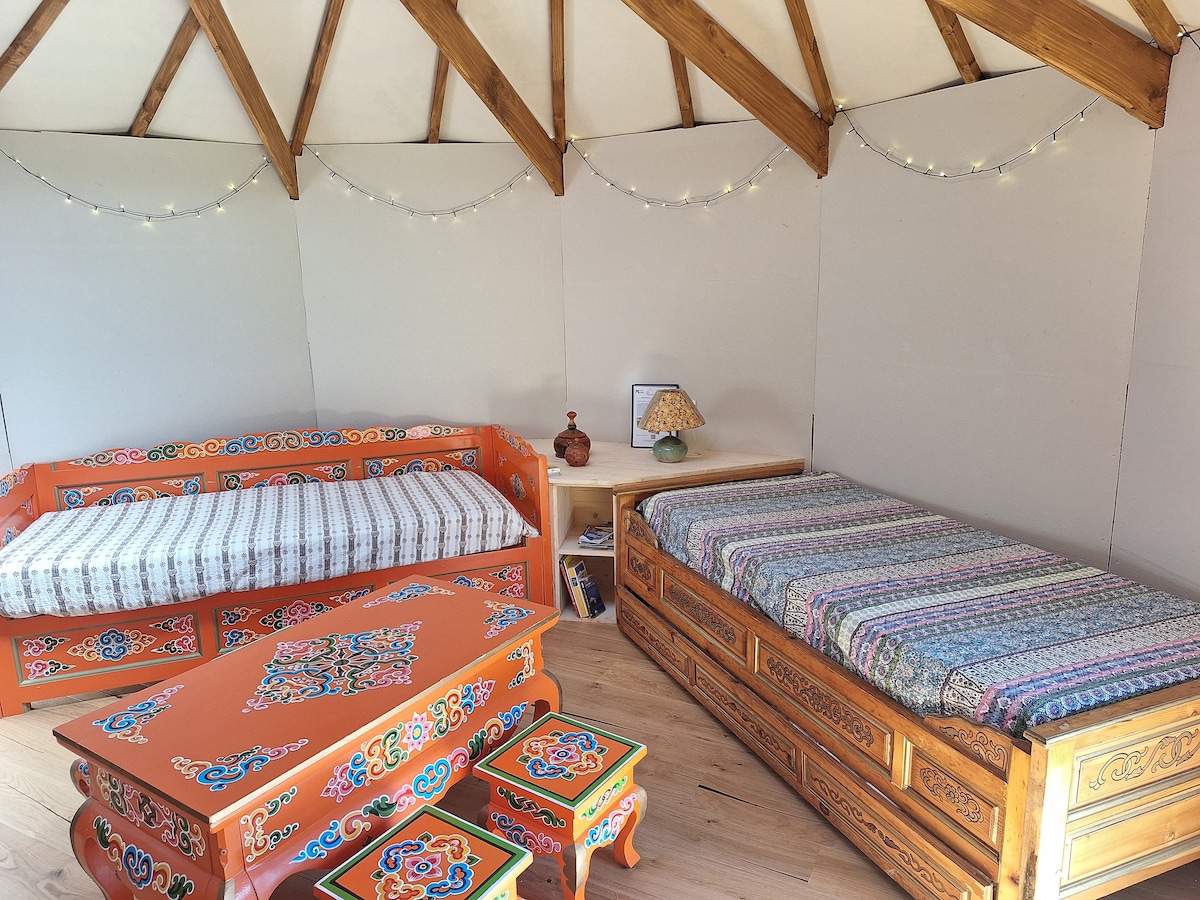 Dans une ambiance cocooning, Yourte mongole authentique jusqu'à 4 pers : un lit double et deux lits simples. Le petit déjeuner ( compris dans le prix de la nuitée ) sera préparé à votre réveil. Un petit chalet pour votre salle d'eau privative (douche italienne, meuble vasque, WC) mais également un réfrigérateur, un micro-ondes, une bouilloire, vaisselle. Votre environnement sera très boisé : séquoia, cèdre du Liban, noyer, bouleau, marronnier, sapin et le ponton de la mare aux canards.
