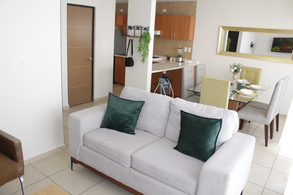 Este Alojamiento cuenta con espacios amplios y cómodos, perfectos para descansar, trabajar o convivir en familia durante tu visita a Pabellón de Arteaga. Es un acogedor departamento de 180m2 en segundo piso cuenta con: 🛏 3 recámaras cómodas para hasta 7 personas 2 baños completos 🛋 Sala amplia con Smart TV de 55” y cantina para momentos especiales 🍽 Comedor con vista a la terraza Cocina equipada Terraza con mesa de jardín, Patio trasero amplio, con espacio para disfrutar en familia