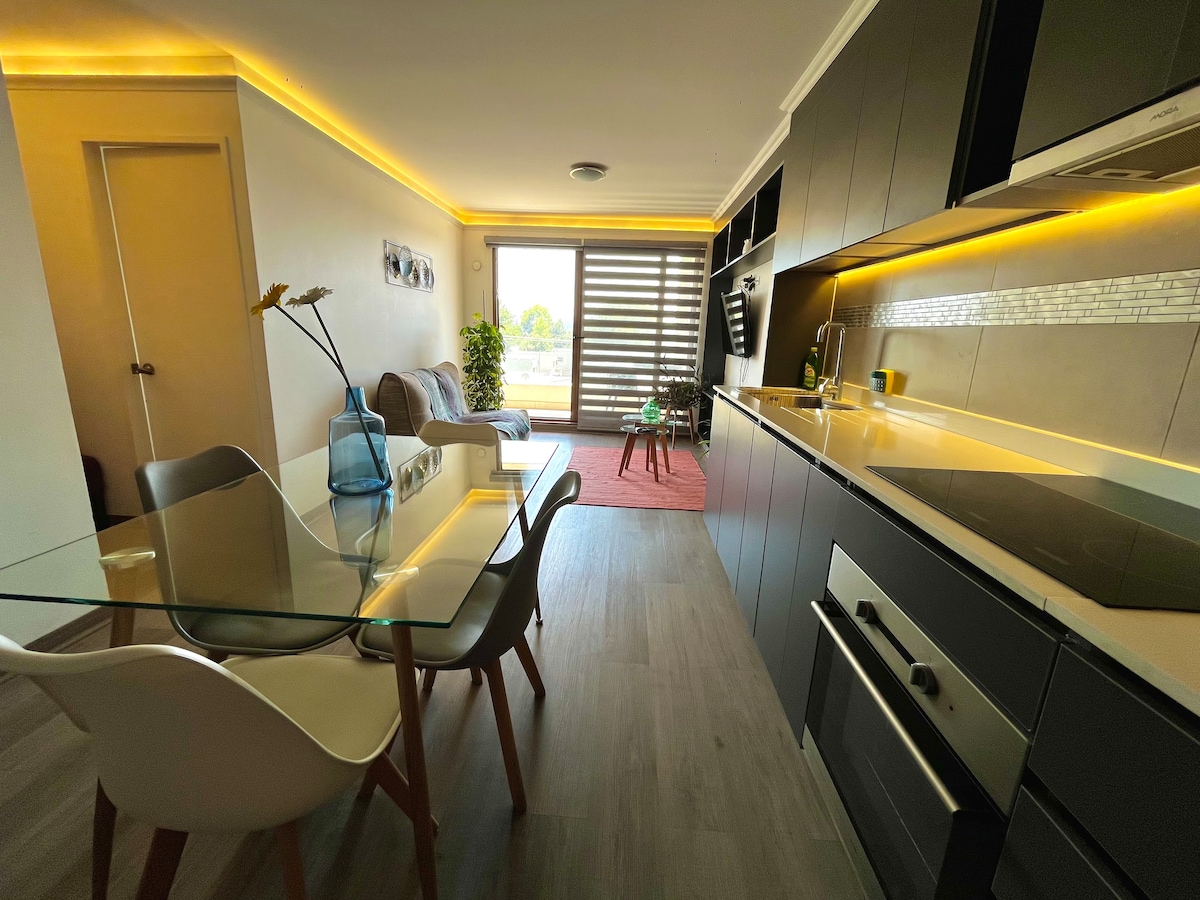 En sector Avellano se encuentra a cuadras de supermercados, colegios, centros comerciales y terminal de buses. Este alojamiento cuenta con conserjería 24 horas, wifi gratuita, cocina amueblada, balcon, estacionamiento privado y áreas de entretención tales como gimnasio, sala de estudio entre otros. El apartamento cuenta con utensilios de cocina y baño, refrigerador, encimera, Smart TV, comedor, 2 baños, 2 dormitorios y clósets. Cabe destacar que la limpieza se realiza con amonio cuaternarion