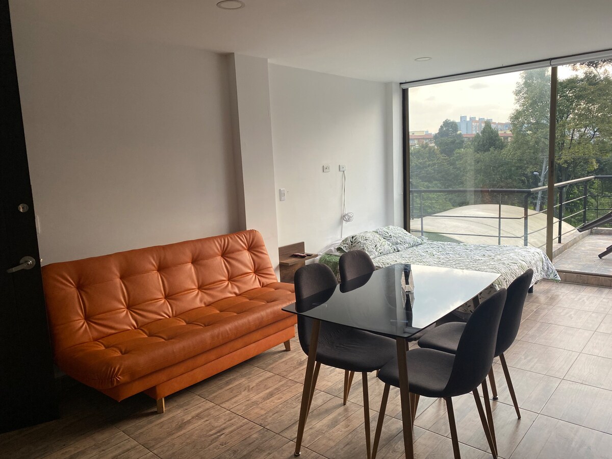 我們舒適的單人睡房,離開工作室,室內位置,配有朝向車庫的窗戶,還有通往庭院、波西米亞式、簡約,配有小花園,體驗真正的都市風情! 它舒適地容納四人,位於街道中心,可輕鬆前往西蒙玻利瓦爾大都會公園( Simon Bolivar Metropolitan Park )。 使用完整的廚房,並使用Transmilenio。 這個空間非常適合兩人入住;然而,如有需要,我們為另外兩人提供一張高品質的沙發牀。熱水