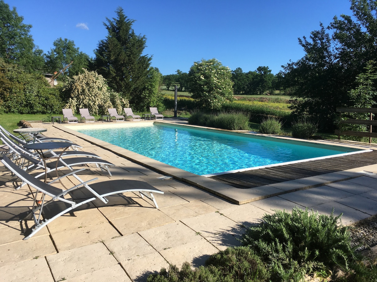 這間寬敞舒適的Gite位於城堡的庭院內。 從庭院進入,以及通過(季節性)泳池西露臺的雙門進入。 盡情欣賞草地、森林邊緣、遊泳池和西方的美景。 Belbouys位於35公頃的私人土地上,我們只歡迎成人入住,因此保證隱私和寧靜。 可容納4-6人。 歡迎來美麗的景觀、花園、果園和狗狗!