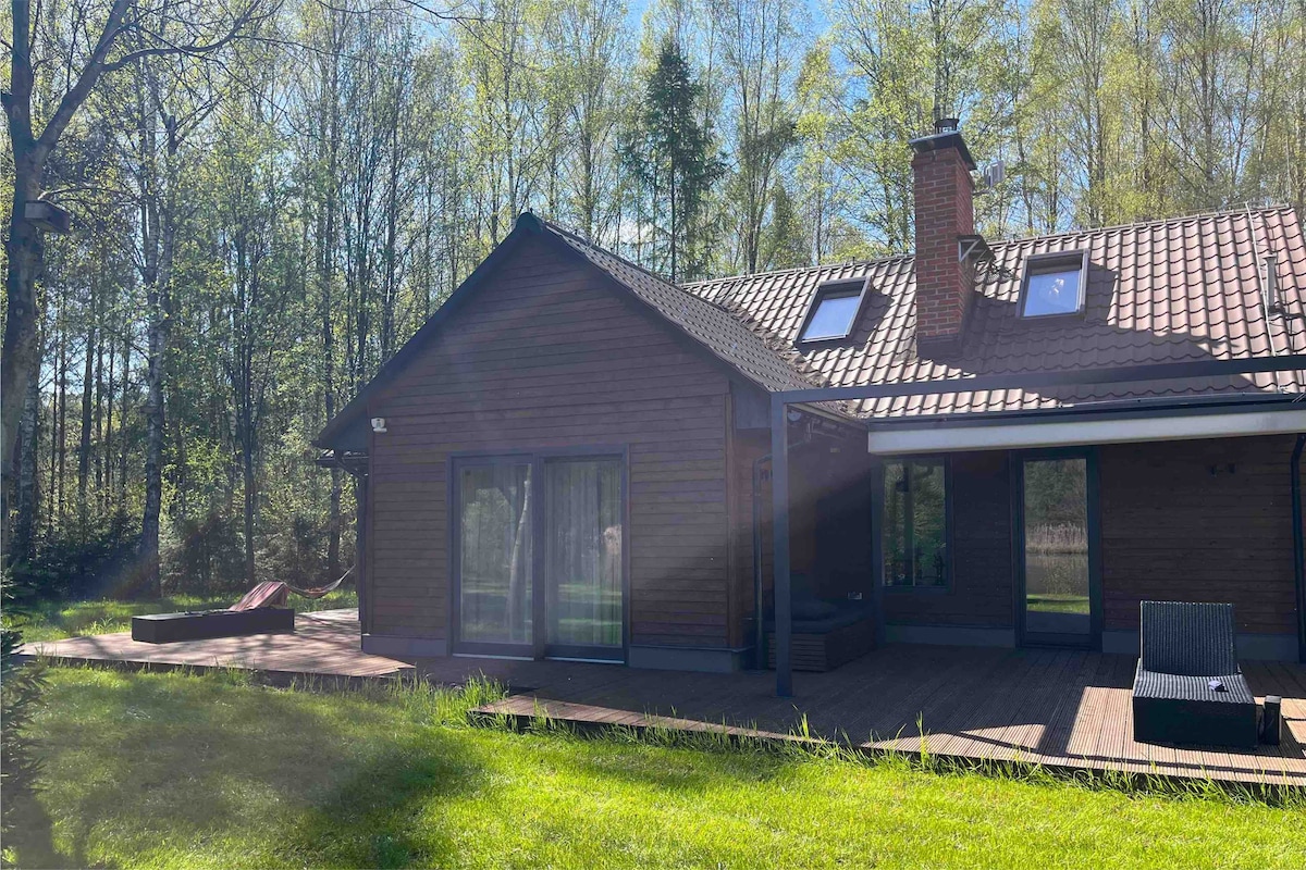 綠意盎然的私人人工湖景觀。 在4英畝的私人土地上享受森林的聲音和自由! 小屋非常適合大自然愛好者,他們在徒步旅行、騎馬、遊泳、採摘蘑菇、釣魚和湖上兜風,享受自己的船或自行車! 這片土地被籬笆包圍。 * *有Wi-Fi * *