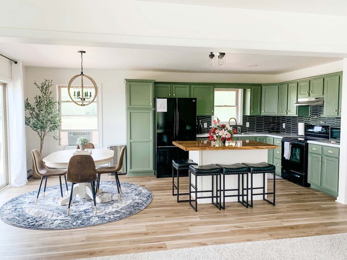 Quiet location nestled between farmland and state gameland. Gorgeous view and sunsets overlooking seven mountain ridges. Newer construction featuring spacious kitchen, large master bedroom with whirlpool tub, and modern appliances. Basement was just completed in 2025. Now with a separate bedroom and playroom. Large Playground outside with plenty of swings and slides. Outdoor fire pit/grill with picnic tables, umbrellas, and lawn chairs. Wood and lighter fluid provided.