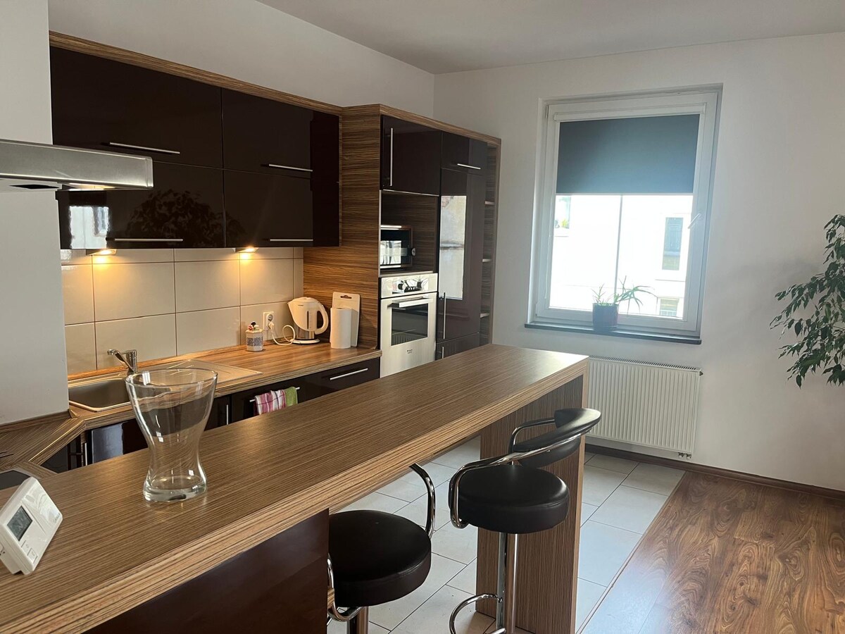Two bedroom apartment with two double bedrooms with double beds and living room with king size sofa bed. Dining table with chairs, flat screen TV. Fully fitted kitchen is generously equipped with all appliances -oven, cooker, dishwasher, fridge freezer, washing machine, microwave etc and comes with all kitchen essentials. You will also find a cafe maker Tchibo. Large bathroom with shower includes towels and all essentials. WiFi is available in entire apartment. Parking available on the premises.