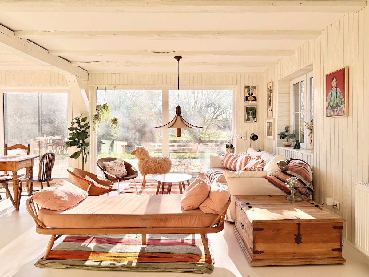 Wahlsdorf 73,這是一個停留或行動、度假或(共同)工作、自由空間和安靜、新鮮空氣、寬敞、大量花園和基礎設施以及(也)您可以從中獲得的東西。 我們在四邊院子的舊馬廄中改建了兩間度假公寓。兩者都可以單獨租用。或者整套房子,包括寬敞舒適的公共廚房和工作、排練、瑜伽或辦公空間。