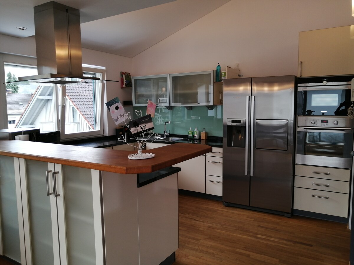 在這個安靜、時尚的住所中,您可以放鬆身心,享受大約 125 平方公尺的生活空間,四周環繞著大自然。您可以在這裡獨享 360 度的森提斯山/博登湖景觀,但又非常靠近景點,例如 St.Gallen/Appenzell。 這座擁有200年歷史的阿彭策爾式房屋坐落在赫里紹(Herisau AR)上方,其主人親切地稱之為「GöttiFritz」。它在夢幻的山丘景觀中閃耀著真實的光芒——是真正的靈魂的避難所。